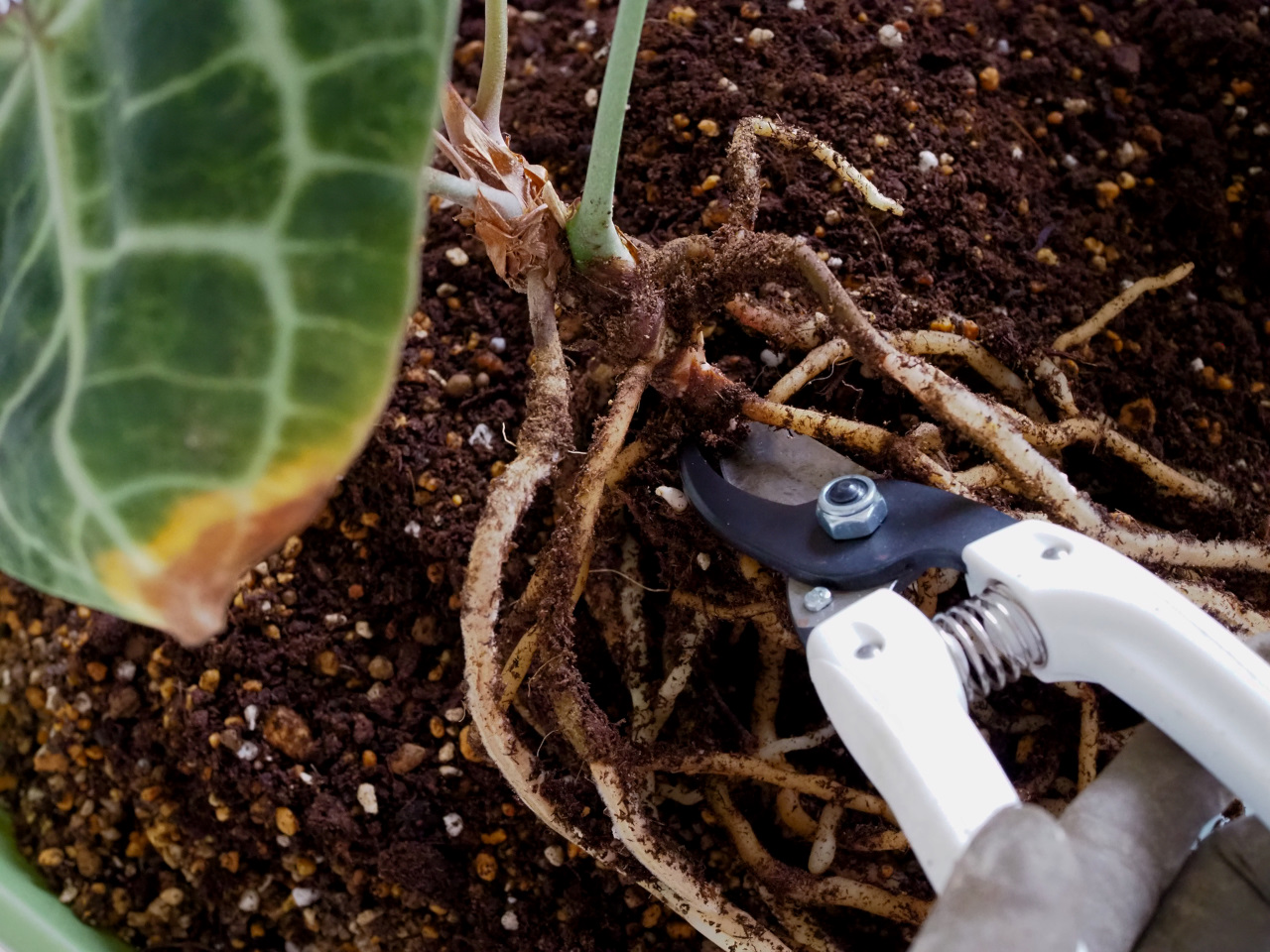 アンスリウム・クラリネルビウムをサイズダウンしたくて、根をカットしました。